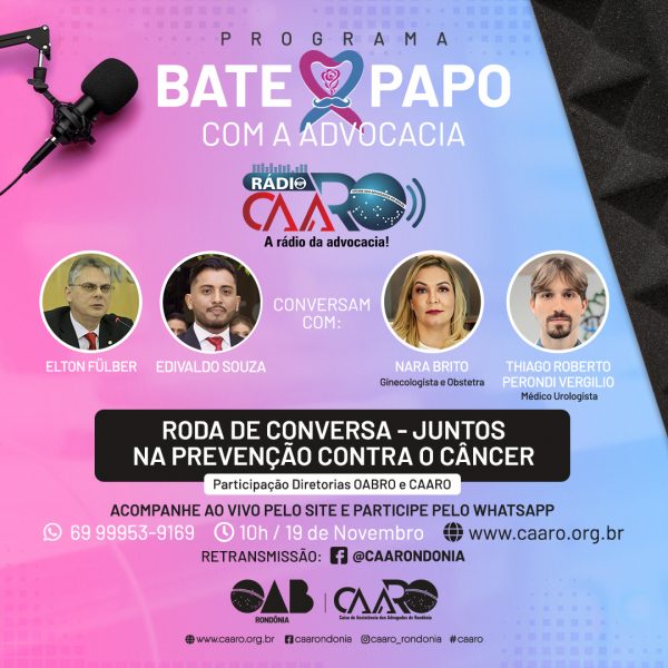 O programa Bate-papo com a Advocacia, transmitido pela Rádio CAARO de segunda a sexta-feira às 10h, apresenta nesta quinta-feira (19) uma Roda de Conversa com a temática “Juntos na prevenção contra o câncer”.
