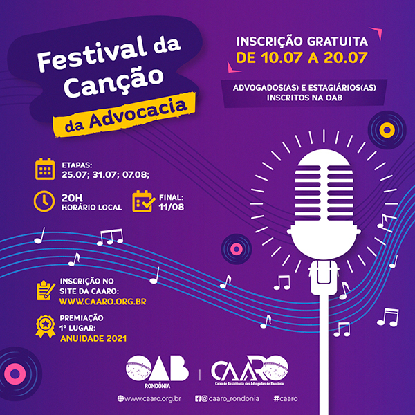 Advogados (as) podem começar a ensaiar e aquecer a voz, pois já estão abertas as inscrições para o Festival da Canção da Advocacia, promovido pela Caixa de Assistência dos Advogados de Rondônia (CAARO).