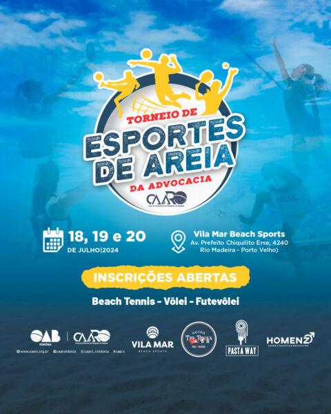 A Caixa de Assistência dos Advogados de Rondônia (CAARO), em parceria com o Vila Mar Beach Sports, anuncia o lançamento do 1º Torneio de Esportes de Areia da Advocacia, a ser realizado nos dias 18, 19 e 20 de julho, em Porto Velho.