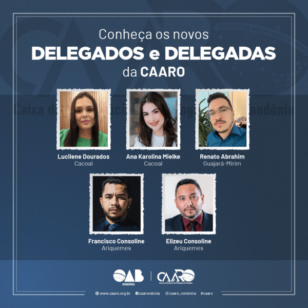 A Caixa de Assistência dos Advogados de Rondônia (CAARO) nomeou cinco novos delegados e delegadas para fortalecer ainda mais sua representação em todo o estado. Os advogados Elizeu Consoline, Francisco Consoline, Renato Abrahim, Ana Karolina Mielke e Lucilene Dourados atuarão nos municípios de Ariquemes, Guajará-Mirim e Cacoal, respectivamente.