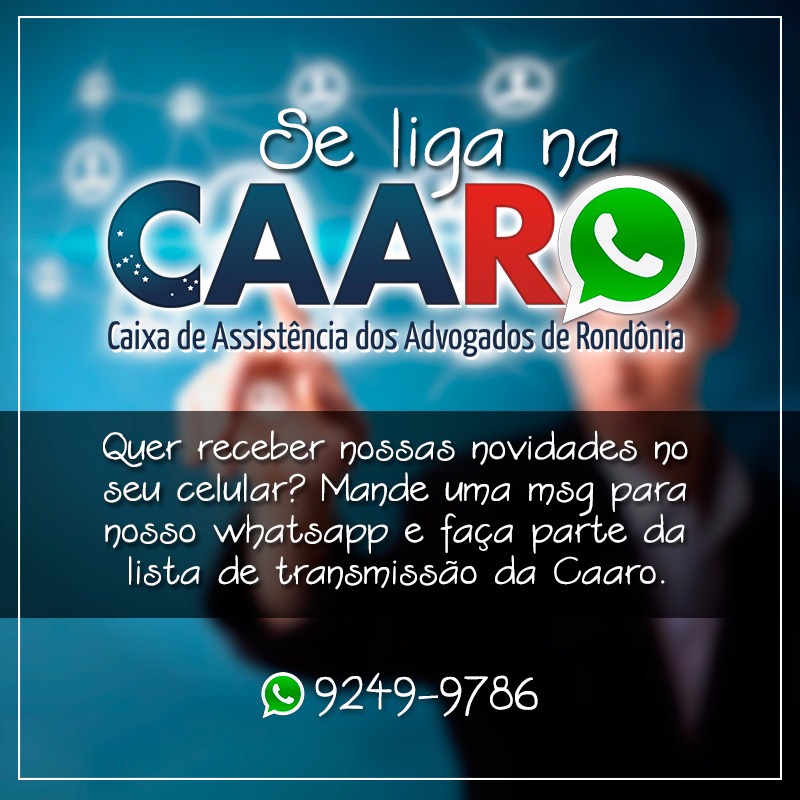 whatsNa busca de estar cada vez mais próximo dos seus associados a CAARO – Caixa de Assistência dos Advogados do Estado de Rondônia criou listas de transmissão no aplicativo whatsapp. O objetivo é proporcionar a interação e a troca de conteúdo entre os advogados de Rondônia. Para fazer parte desta lista, basta enviar seu contato para o número 9249-9786. Participe!
