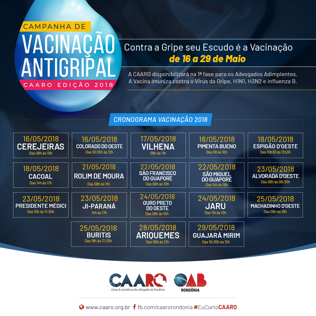 A CAARO disponibilizará na 1ª fase para os Advogados Adimplentes. A Vacina imuniza contra o Vírus da Gripe, H1N1, H3N2 e influenza B. Confira o cronograma abaixo: