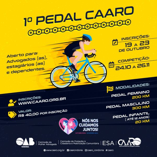 Já estão abertas as inscrições para o 1º Pedal CAARO, promovido pela Caixa de Assistência dos Advogados de Rondônia em parceria com a Comissão da Mulher Advogada e a Comissão de Proteção à Cidadania e Mobilização Comunitária da OAB Rondônia. As inscrições tem o custo de R$ 40,00 e vão de 19 a 23 de outubro podem ser realizadas AQUI, o comprovante de pagamento da inscrição precisa ser enviado ao e-mail [email protected] confirmação da mesma.