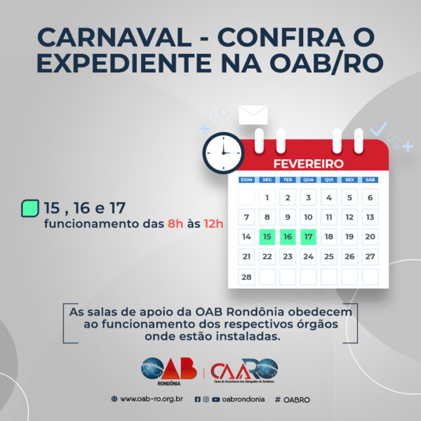 A Seccional Rondônia da Ordem dos Advogados do Brasil (OAB/RO) e a Caixa de Assistência dos Advogados de Rondônia (CAARO) comunicam a advocacia e público em geral que o funcionamento na Seccional nos dias 15, 16 e 17 de fevereiro (segunda a quarta-feira) ocorrerá com horário de expediente das 8h às 12h, na sede da OAB incluindo o Espaço CAARO.