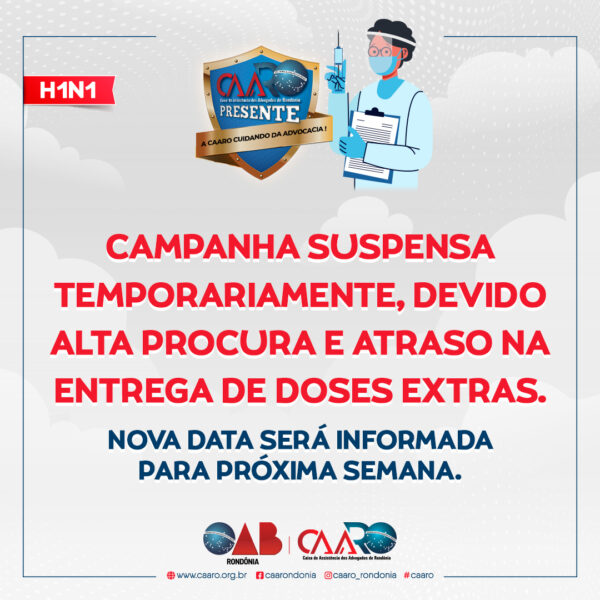 A Campanha de Vacinação contra a gripe H1N1 promovida pela CAARO, está suspensa temporariamente devido a alta procura e atraso na entrega de novas doses.