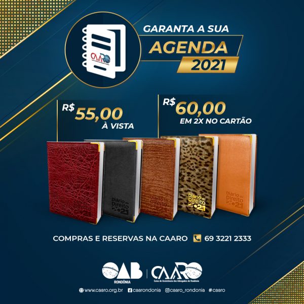 As agendas estão disponíveis a pronta entrega na Sede da CAARO (Edifício da OAB), no Espaço CAARO ou no Estacionamento da CAARO ao lado do novo Fórum de Porto Velho, ao custo de R$ 55,00 a vista ou R$ 60,00 em duas vezes no cartão de crédito. Mais informações: 69 3221 2333.