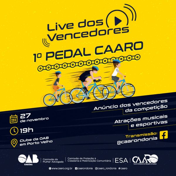 Em sua primeira edição o campeonato ciclístico promovido pela Caixa de Assistência dos Advogados de Rondônia (CAARO), contou com a participação de dezenas de advogados e seus familiares que ficarão sabendo no dia 27 de novembro a classificação dos competidores durante a Live dos vencedores do 1º Pedal CAARO.