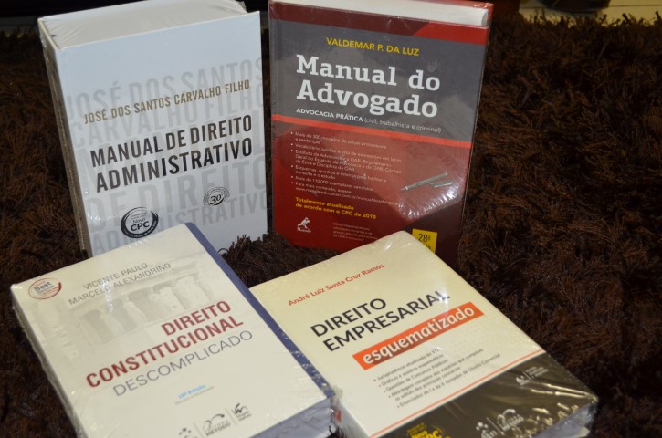 Manual do Advogado de Valdemar P. da Luz, Manual de Direito Administrativo de José dos Santos Carvalho Filho, Vade Mecum Saraiva 2016, Método Penal, Método Civil e Compacto Saraiva.