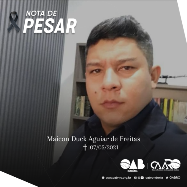 A OAB Rondônia e a Caixa de Assistência dos Advogados de Rondônia (CAARO), comunicam o falecimento do bacharel em Direito, Maicon Duck Aguiar de Freitas, filho do advogado Husmath Gerson Duck de Freitas, sobrinho do advogado Evaldo Duck e primo do advogado Dr. afael Duck.