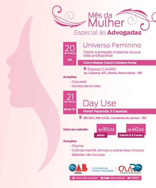 Em celebração ao Dia Internacional da Mulher, comemorado anualmente no dia 8 de março, a Ordem dos Advogados do Brasil – Seccional Rondônia (OAB/RO) e a Caixa de Assistência dos Advogados de Rondônia (CAARO), por meio da Comissão da Mulher Advogada (CMA), promoverão nos dias 20 e 21 deste mês, dois eventos voltados para o público feminino, em especial às advogadas do Estado.