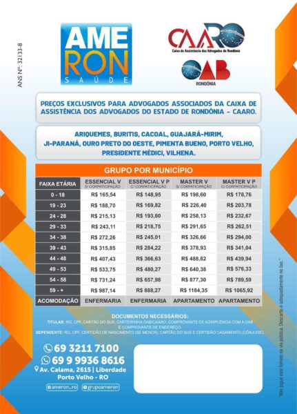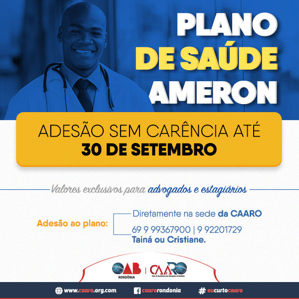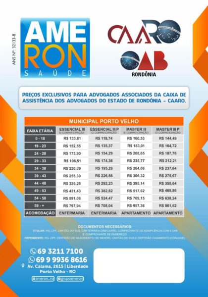O convênio firmado entre a Caixa de Assistência dos Advogados de Rondônia (CAARO) e a Assistência Médica e Odontológica de Rondônia (Ameron), possui uma tabela com valores exclusivos para classe advocatícia, com cobertura ambulatorial (exames e consultas) e hospitalar (internações e cirurgias).