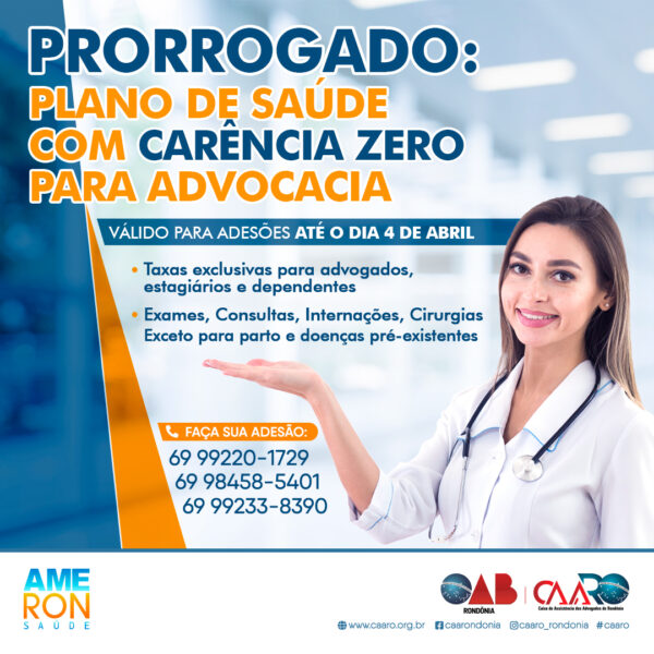 A Caixa de Assistência dos Advogados de Rondônia (CAARO) conseguiu junto a Ameron Saúde a prorrogação de prazo para adesão aos planos com carência zero até o dia 4 de abril (exceto para parto e doenças pré-existentes).