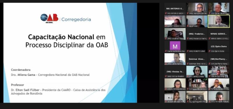 A capacitação foi promovida nesta segunda-feira (07.11), ao vivo, por meio de videoconferência. O presidente da Caixa de Assistência dos Advogados de Rondônia (CAARO), Elton Fülber, ministrou uma nova etapa do curso sobre Procedimentos do Processo Ético-Disciplinar da OAB Nacional. Participaram do evento integrantes do Sistema OAB dos estados de Minas Gerais, Ceará e Espírito Santo.