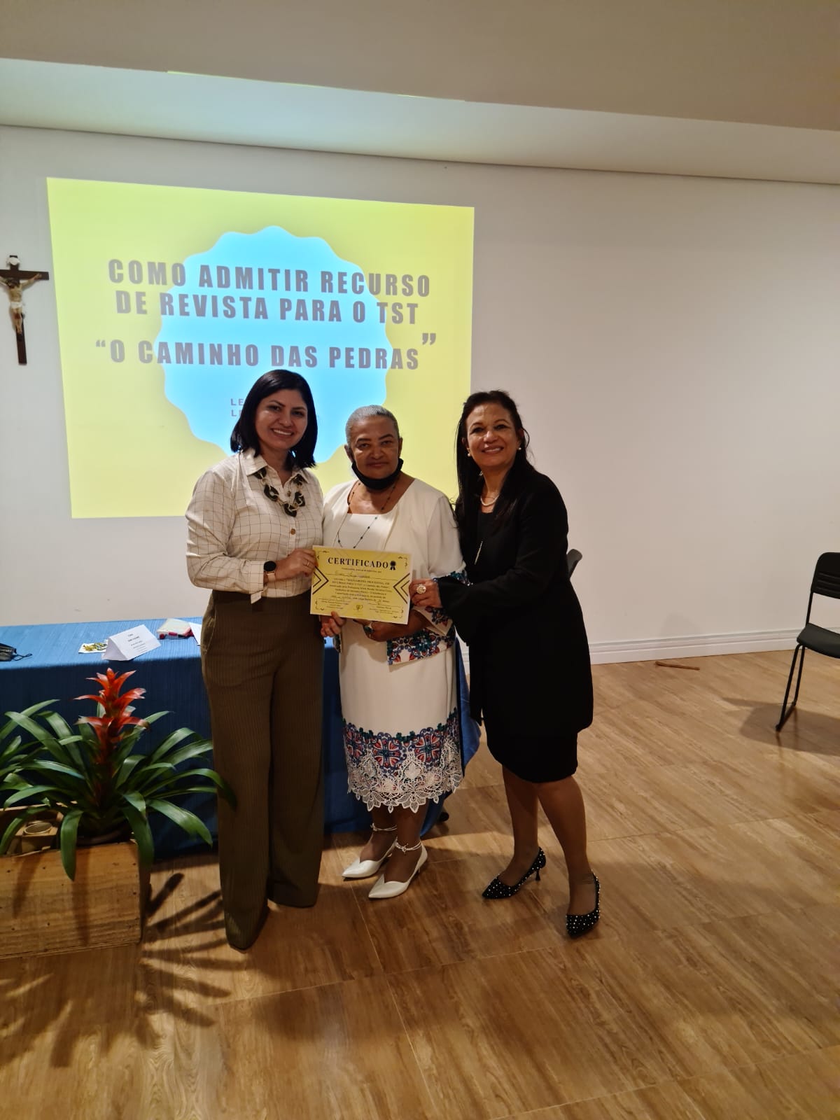 A professora Pérola explica porque a Turma recebeu o nome da Presidente, em exercício da CAARO: “A Drª. Glória Chris Gordon é uma ‘Caminhante’ desse ‘Caminho de Pedras’, rumo a uma Justiça Social. Por sua dedicação e disciplina, destaca-se, hoje, também, na atuação técnica em Tribunais Superiores. É um exemplo para toda a advocacia que deseja fazer essa complexa travessia para o Tribunal Superior do Trabalho”.