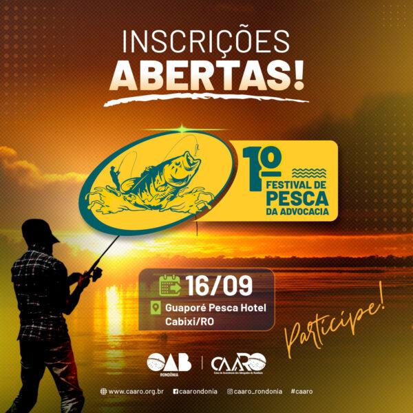 No dia 16 de setembro, a Caixa de Assistência dos Advogados de Rondônia realizará o 1º Festival de Pesca da Advocacia, na modalidade pesca-esportiva, no Guaporé Pesca Hotel, no município de Cabixi. As inscrições estão abertas e podem ser realizadas até o dia 02 de Setembro, preenchendo a ficha de inscrição disponível no site da CAARO, conforme regulamento. (Clique aqui).