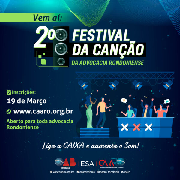 Buscando repetir o sucesso da primeira edição a Caixa de Assistência dos Advogados de Rondônia, abre a partir desta sexta-feira (19), as inscrições para o 2º Festival da Canção da Advocacia Rondoniense, evento exclusivo para profissionais inscritos na Seccional Rondônia, amadores ou profissionais na música.